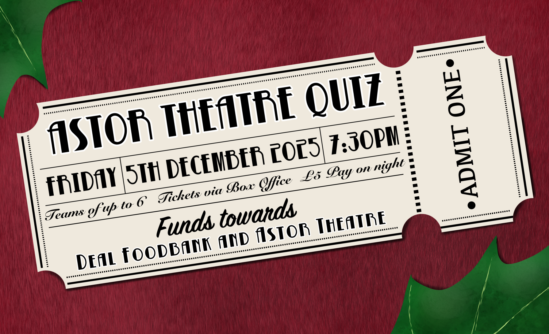 Friday 5th December 7.30pm - Tickets £5 - available via the box office either by email (boxoffice@theastor.co.uk) or phone 01304 370220 - reserve your seat and pay on the night